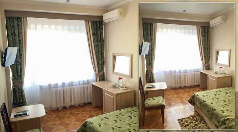 Номер со всеми удобствами рассчитан на одного человека, площадь 9-12 м2, совмещенный санузел с ванной. Есть спутниковое кабельное телевидение.