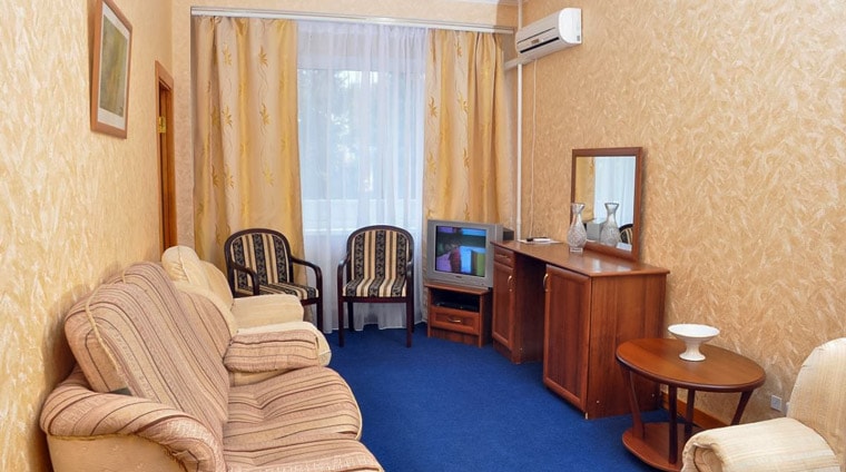 Номер со всеми удобствами, площадь 24 кв.м., состоит из гостиной, спальной комнаты и совмещенного санузла с душевой кабиной, гидромассажем. Номер телефонизирован, есть спутниковое кабельное телевидение.